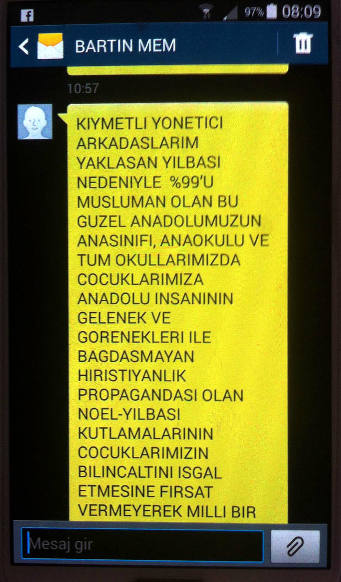 Bartın Milli Eğitim Müdürü Yaşar Demir, okul müdürlerinin cep telefonlarına gönderdiği mesajda, yılbaşı kutlamalarının 'Hıristiyanlık propagandası' olduğunu ileri sürerek, 'bu kutlamaların çocukların bilinçaltını işgal etmesine fırsat verilmemesini' istedi. İl Milli Eğitim Müdürü Yaşar Demir, yılbaşı nedeniyle kentteki 108 okul müdürünün cep telefonuna mesaj gönderdi. Mesajda şöyle deniliyor:
