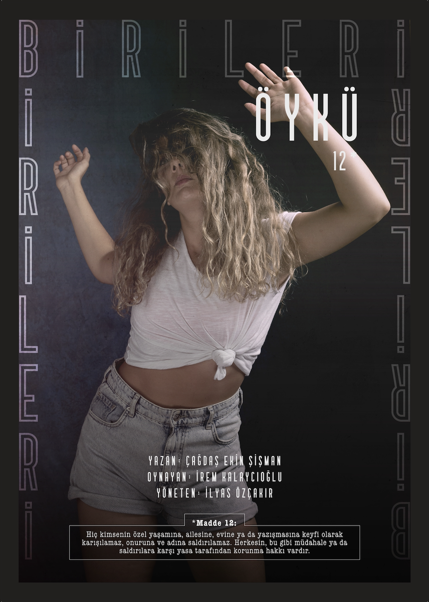 Çağdaş Ekin Şişman’ın kaleminden, bildirgenin 12. maddesinden yola çıkarak özel yaşamın korunması hakkı üzerine olan kısa oyunda, İrem Kalaycıoğlu, ‘Öykü’ karakterine can veriyor. Kurumsal bir şirkette, başarılı bir kariyeri olan ve bir sosyal medya paylaşımı sebebiyle işten kovulan Öykü, özel hayatının kurumsal kimlikleri zedeleyen yönlerini gizleme ve törpüleme çabasında kendi varlığını tehdit eden bir noktaya sürükleniyor.