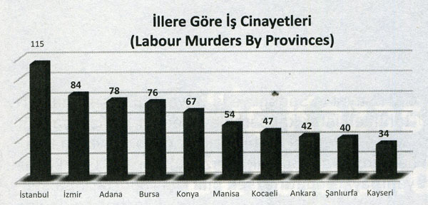 İşçi Sağlığı ve İş Güvenliği Meclisi’nin verileri ve Adalet Arayan Destek Grubu’nun medya taramaları sonucu ortaya çıkan verilere göre, 2015’te en az 1703 işçi çalışırken hayatını kaybetti; bunlardan 49’u çocuktu. 173 işçinin hayatını kaybettiği Eylül ayı, iş cinayetlerinin en çok meydana geldiği dönem olurken, en ‘ölümcül’ sektör, yine inşaat oldu. 418 işçinin hayatını kaybettiği inşaat sektörünü; tarım, taşımacılık, genel işler, ticaret ve madencilik izliyor. En çok işçinin hayatını kaybettiği il de İstanbul oldu.