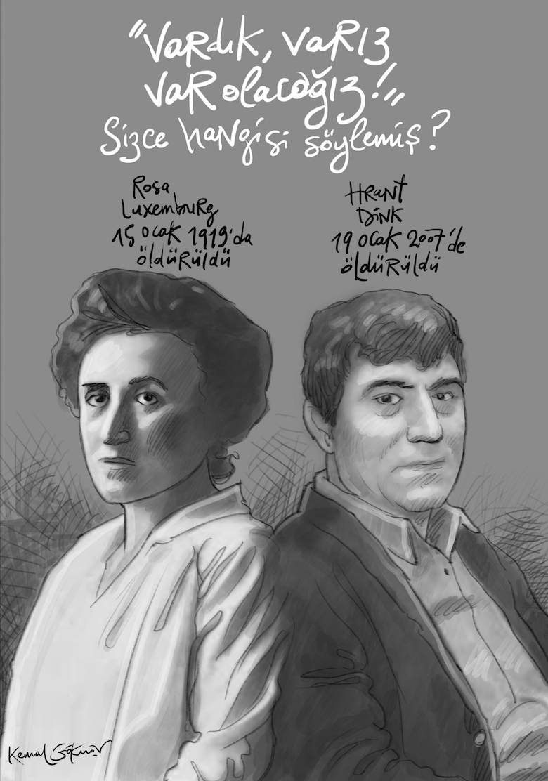 Kaçıncı portreni çiziyorum? Uzun bir sohbet gibi bu çizim anları. Eskiden geçirdiğimiz çarşambaları, Agos sabahlamalarını hatırlatıyor. Ayaklarında tokyolarınla ara sıra çıktığın odandan, nerede duysam sahibini bildiğim bir şarkının melodisi koca sesinle konuşuyorsun. Hiç eksilmeyen etli dolma kokusu; ev sıcaklığı. Gülen resimlerini seçiyorum hep. Yeni çocuklar geliyor; 12 yıl oldu. Onlar da sana en çok yakışan halini, gülümseyen halini görsünler.