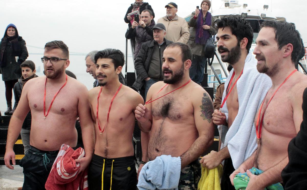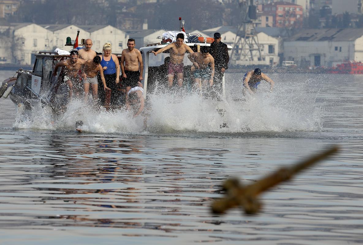 Buradaki tören Metropolit Athanasios Papas'ın haçı denize atmasıyla başladı. Teknede bekleyen 5 genç, haçı çıkarmak için suya atladı.