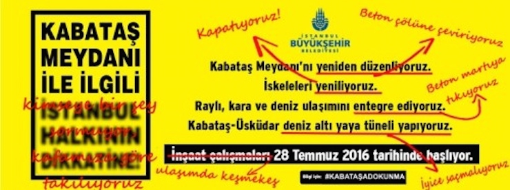 Kent Savunması tarafından yapılan yazılı açıklamada, “Sen de gel, İstanbul’a, tarihine, kültürüne, doğasına ve kolektif hafızasına karşı işlenecek en büyük suçlardan biri olan bu projeye karşı hep birlikte ‘Kabataş’a Dokunma!’ diye haykıralım” denildi.