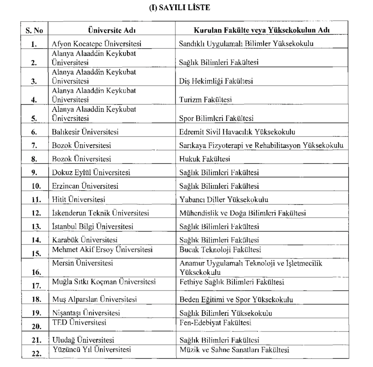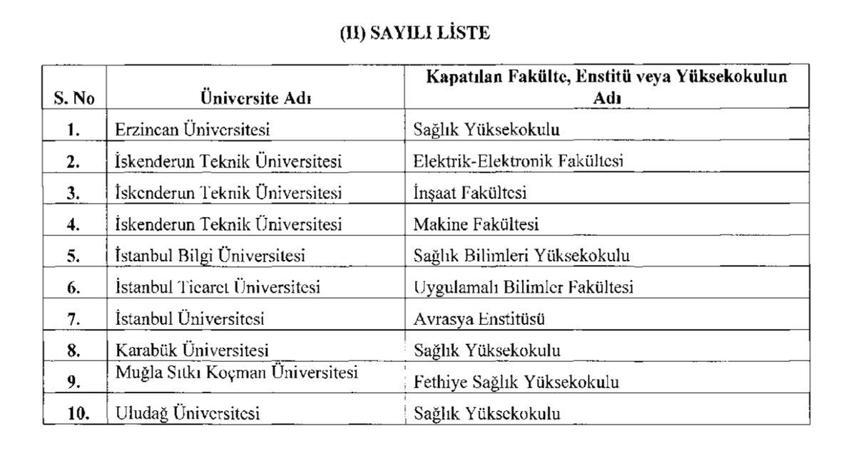 Kararname kapsamında kapatılan vakıf üniversiteleri ise şöyle,