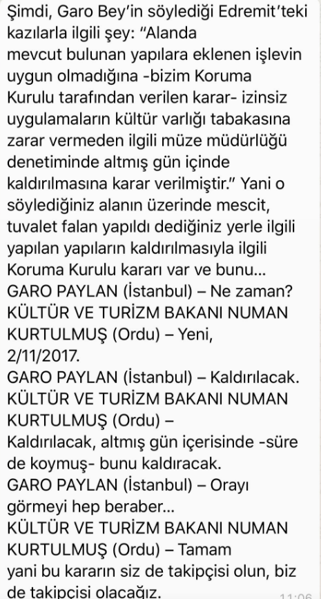"Değerli Hemşerilerim; yaz aylarında Edremit halk plajını hep beraber açtık. Buradaki binaların 1967 yılında yapıldığını, harabe halde olduğunu, buraları temizleyip hizmete açtığımızı daha öncesinde paylaşmıştım. Bu hizmeti karalamak için hertürlü çaba içine girdiklerini de hatırlarsınız. Şimdi de Kültür ve Turizm Bakanımızın buradaki asfaltın bir kısmının kaldırılması ile ilgili açıklamasını çarpıtıyorlar. Birinci ağızdan söylüyorum basit bir asfaltın parke taşı ile değişimi(100 m2) mevzusunu kendi yalanlarına alet etmeye çalışıyorlar. Herhangi bir bina veya yapı yapmadık ve YIKMAYACAĞIZ. Burada bir ermeni mezarlığı da YOK! Tüm gayretimizle Vana ve Edremite hizmet etmeye devam edeceğiz, Ermeni asıllı Milletvekili Garo Paylan ve bu konuyu takip eden herkese buradan ifade ediyorum; bu doğa harikası yeri daha da güzelleştireceğiz, bu memlekette yaşayan herkesi oraya götürecek ve burayı insanımızın hizmetine kazandıracağız. Seneye tekneler, jetskiler, yelkenler ve tüm modern imkanlarla kalitesini artırarak insanımıza hizmete devam edecek inşallah. Kalın selametle."