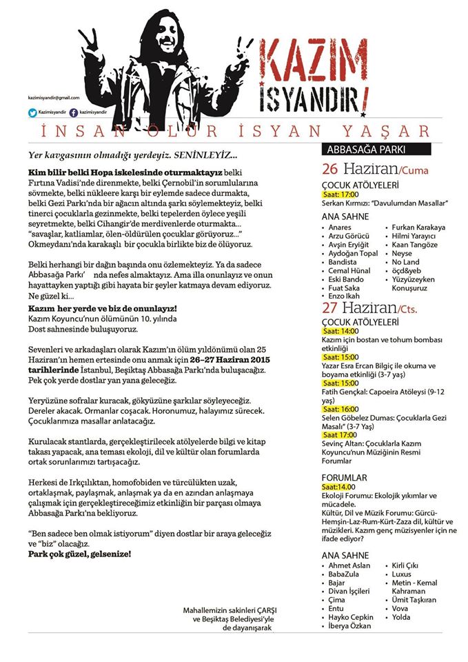 ‘Kazım İsyandır Platformu’ tarafından organize edilen etkinlik kapsamında, çocuk atölyeleri kurulacak, ekoloji, dil ve kültür üzerine forumlar düzenlenecek, yeryüzü sofrası kurulacak.