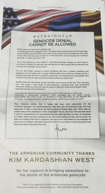 Bugün New York Times Gazetesi’ne verilen tam sayfa ilanda Kardashian'ın mektubu basıldı. Ermeni Eğitim Vakfı’nın ‘Kim Kardashian’a teşekkürler’ ibaresiyle yayımladığı mektupta şu ifadeler yer alıyor: