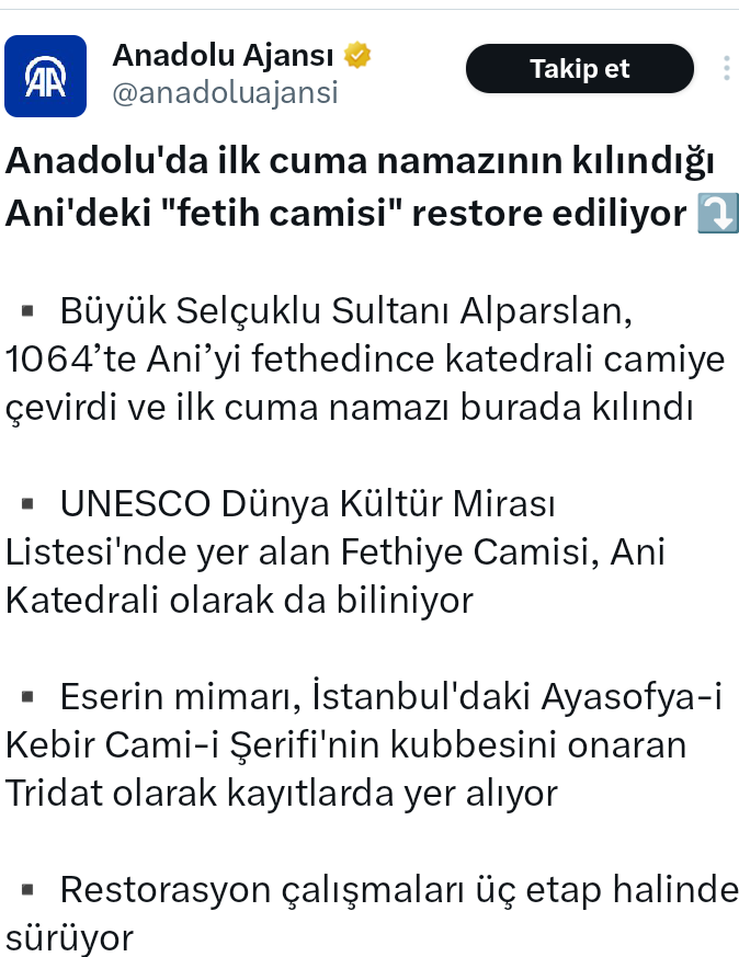 “Ani Ören Yeri Kazı ve Alan Başkanı Doç. Dr. Muhammet Arslan’ın AA’ya verdiği röportajdaki açıklamalarını takiben Ani Katedrali’nin camiye dönüştürüleceği haberlerine dair Kültür ve Turizm Bakanlığı’ndan resmi bir bilgilendirme yapılmadı. Ani Katedrali’nin restorasyonu, World Monuments Fund ve Kültür ve Turizm Bakanlığı’nın sorumluluğunda gerçekleştiriliyor. Bilgi tabelalarında da açıkça ifade edildiği gibi son iki yıldır ikinci etap güçlendirme çalışmaları yapılıyor.