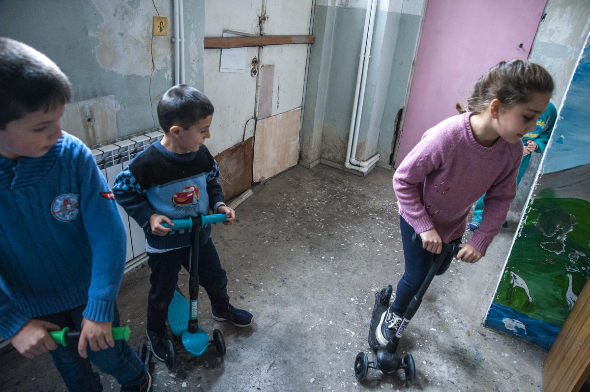 Overwhelmed by reminiscing about all these, I was ready to leave the kindergarten. But then, Berge said there was a family upstairs and they were willing to talk to us. No matter how daunting the task we undertook, we were determined to meet as many people as possible. Yet this second interview left us all in tears. We met a [displaced] family of seven, who had two-storey houses, both in Stepanakert, the capital of the Nagorno-Karabakh Republic, and in a village close to the capital. Their eldest son was a third-year university student at medical school and his education was now interrupted. This was also the case for their daughter. She was attending a [private] college [in Nagorno-Karabakh], but she could not find a corresponding school with the same profile in Artashat. “I don't want to go to a regular high school,” she said. Their father was lamenting that he had to leave everything behind. His other three children were more interested in play rather than school.