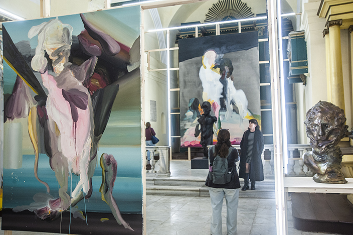 Pilevneli’nin organizasyonuyla gerçekleşen sergide, Zümrütoğlu’nun 2018–2023 yılları arasında ürettiği büyük ölçekli tuvaller ve heykeller yer alıyor. Çalışmalar, kilisenin mimarisiyle kurduğu karşılıklı yankıyla izleyicide hem estetik hem duygusal bir yoğunluk yaratıyor. Kimi zaman koyu renklerin ağırlığıyla, kimi zaman boşluğun sesiyle konuşan işler, geçmişin taşlarıyla bugünün metallerini aynı sessizlikte buluşturuyor.