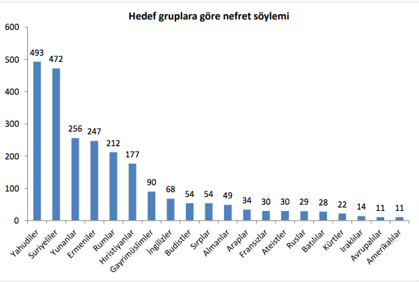 İçeriklerin gruplara göre dağılımına bakıldığında en çok Yahudilere yönelik nefret söylemi yapıldığı görülüyor. Yahudileri Suriyeliler, Yunanlılar, Ermeniler ve Rumlar takip etti. Rapora göre haberlerde Ermeniler Azerbaycan ile Ermenistan arasındaki ihtilafa dair haber ve yorumlarda hedef gösterildi; PKK ve ASALA ile beraber anıldı ve ‘terör’le özdeşleştirildi; ‘düşman’ grupların ve bireylerin arkasındaki güç olarak etiketlendi. Yahudiler, özellikle Mescid-i Aksa’da yaşanan gerginliklerle ilgili haberlerde toplu olarak düşmanlaştırıldı; haberlerde Yahudi kimliği bir hakaret ifadesi olarak kullanıldı. Suriyeliler de haberlerde genellikle cinayet, hırsızlık, taciz gibi kriminal olaylarla anıldı. Suriyeliler, olumsuz ekonomik gidişatın sorumlusu olarak gösterilirken özellikle kadın mülteciler aileye ve topluma yönelik bir tehdit olarak sunuldu.