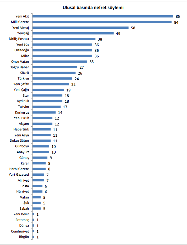 Ulusal basında nefret söylemini en fazla üreten gazete ise yine Yeni Akit oldu; onu Milli Gazete, Yeni Mesaj, Yeni Çağ ve Diriliş Postası takip etti.
