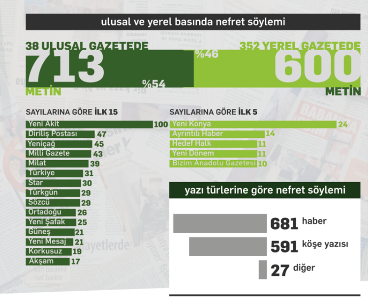 Nefret söylemine en çok yer ver veren gazetelerde Yeni Akit, Diriliş Postası ve Yeni Çağ ilk sıralarda yer aldı.