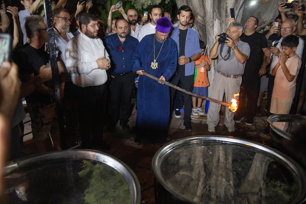 Akşam saatlerinde ise kilisenin bahçesinde davul ve zurnalı geleneksel harisa şenliği düzenlendi. Saat 22:20’de yedi harisa (keşkek) kazanı yakıldı. Kazanlar, Musadağ’ın yedi Ermeni köyünü temsil ediyor.