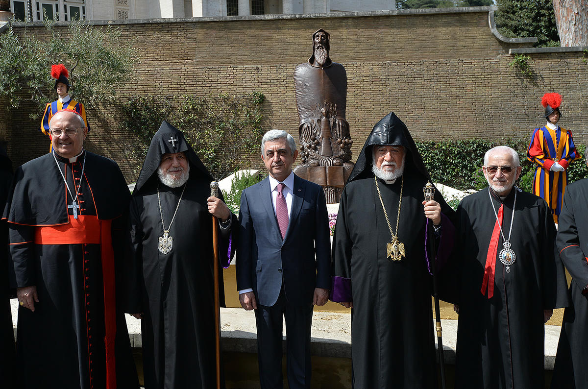 Heykelin açılışı öncesinde Sarkisyan ve Papa Francis sabah saatlerinde biraraya geldi. Görüşmede taraflar Ermenistan ve Vatikan devletleri arasındaki ilişkilerin yanısıra manevi ve kültürel bağları da sıkılaştırmayı sürdürmeye hazır olduklarını ifade ettiler. Buluşma sonunda hediye teatisi gerçekleşti. Sarkisyan Papa Francesco’ya Surp Kayane Kilisesinin gümüş maketini armağan ederken, Papa ise Sarkisyan’a Vatikan müzelerinde muhafaza edilen Kutsal Aileyi resmeden heykelin mermer örneğinin yanısıra kendi yazdığı son 3 kitabın örneklerini armağan etti. (Ajanslar, News.am)