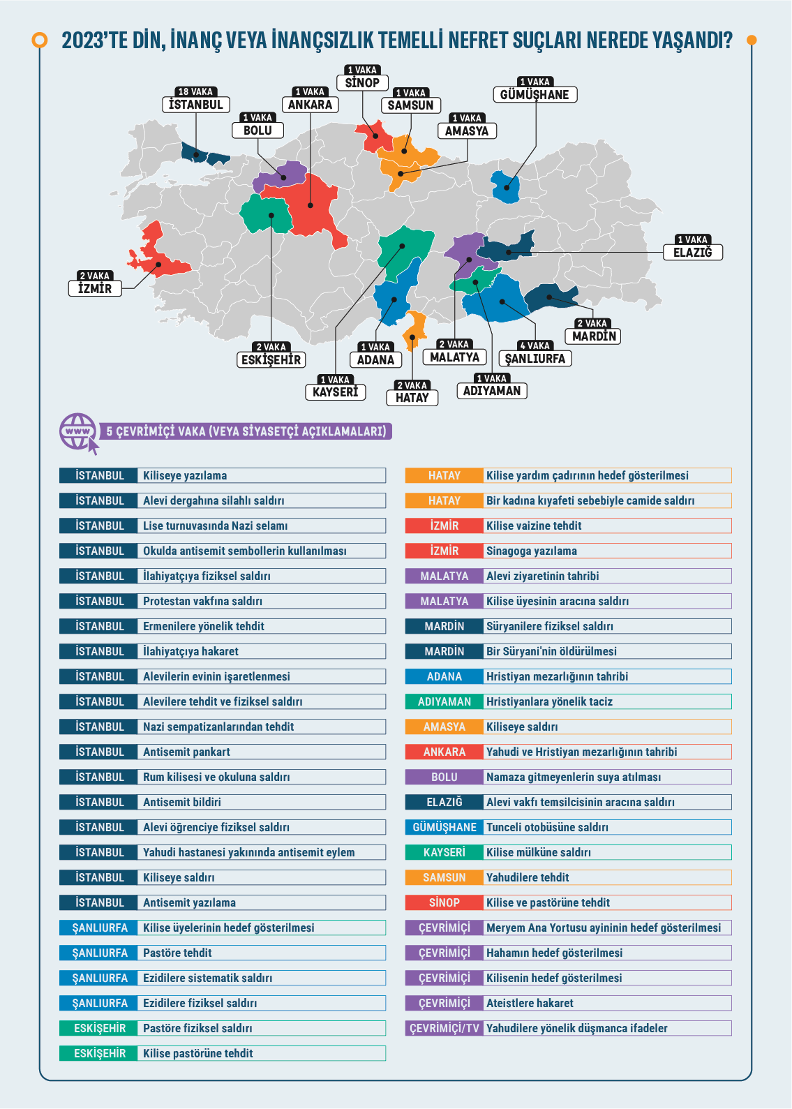 Raporda, 2023 yılında Hıristiyanların 22, Yahudilerin 14, Alevilerin 7, Müslümanların 4, Ezidilerin 2 ve Ateistlerin bir kez hedef alındığı belirtildi.