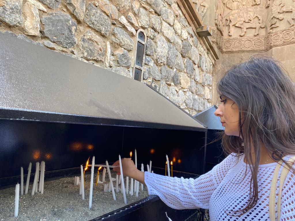 Kiliseden çıktığımızda mum yakılan yere gittik. Lorin, diasporadan gelen bir Ermeni ile konuşuyordu. Montreal’den gelmiş. Ermeni olup olmadığımızı sordu. Olmadığımızı söyleyince Kürtçe birkaç kelime söyleyip şakalaştı bizimle, ismi Kevork’tu. Diasporadan gelen başka Ermeniler de vardı. Ermenice dersi almıştım, tez çalışmam sırasında, o yüzden kulak kesiliyordum konuşmalara, anlamaya çalışıyordum, bir de duvardaki yazıları okumaya çalışıyordum. Unuttuğumu fark ettim. Sevan hocam bu halimi görseydi kızardı bana diye hayıflanıyordum. O an bir dili hatırlamaya çalışmak güzeldi.