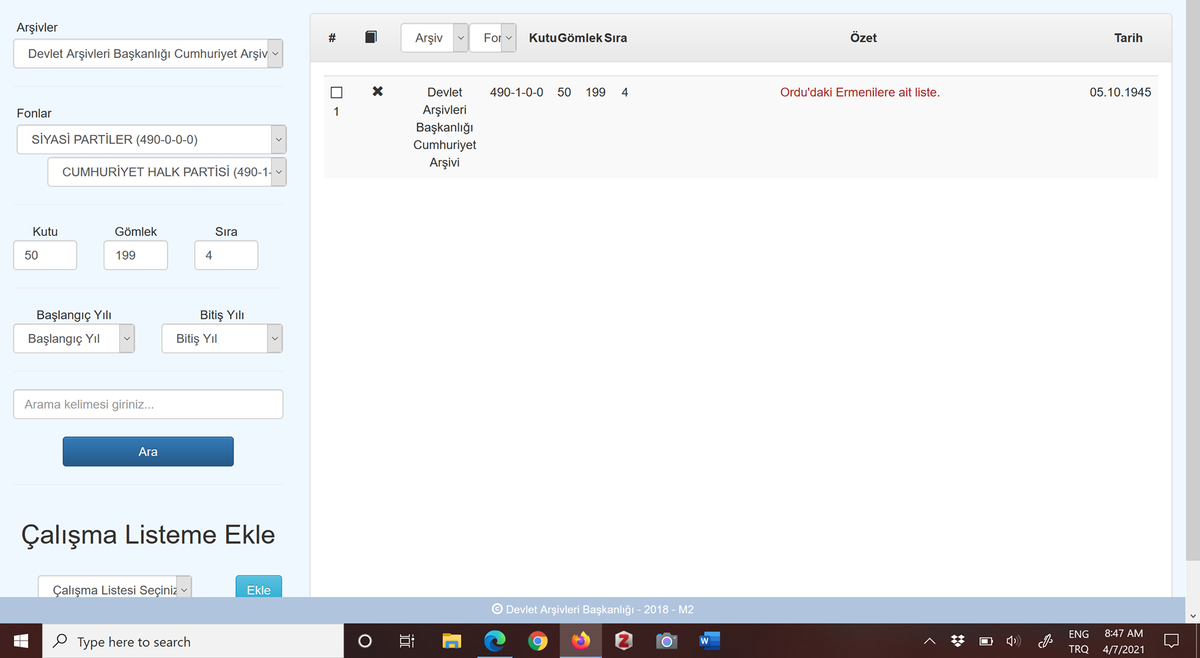 Belge 1945 yılına ait. Dolayasıyla Ordu ili çevresinde bulunan Ermenilerin kaydını gösteren bu listenin Cumhuriyet Halk Partisi’nin devlet olduğu tek parti dönemine ait bir jurnal (İhbar) yani fişleme belgesi olduğunu anlıyoruz.