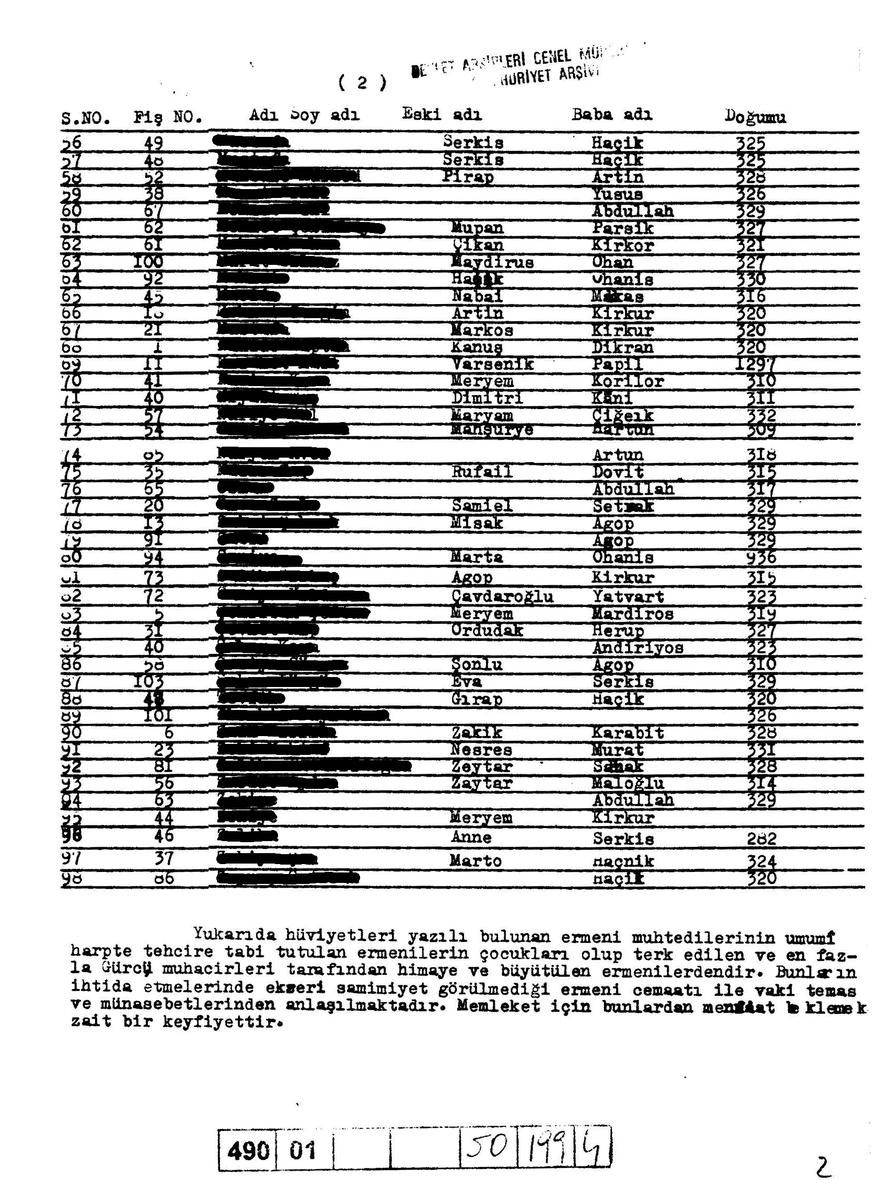 Bu sayfada yer verdiğimiz listelerden Müslümanlaş(tırıl) mış Ermeniler’in isimlerinin kapatıldığını farketmiş olmalısınız. Söz konusu belge Nevzat Onaran'ın 2014 yılında Agos için kaleme aldığı bir yazıda da gündeme gelmişti, o zaman da bu yolu tercih etmiştik. Bu bilinçli bir tercih. Bunu kişilik haklarına saygı çerçevesinde yaptık. Zira kimi vakalarda bazı ailelerin, yaşadıkları bölge ya da çevre itibarıyla, bu bilginin mahrem kalmasını tercih ettiklerini biliyoruz. Böylesi tercihlere saygı göstermek kaygısıyla böyle bir yola gittik. Ancak belgenin arşiv sayfasını da altta yayınlıyoruz. Dolayısıyla isteyenler bu bilgiyi kullanarak kendi aile geçmişlerini öğrenebilirler.