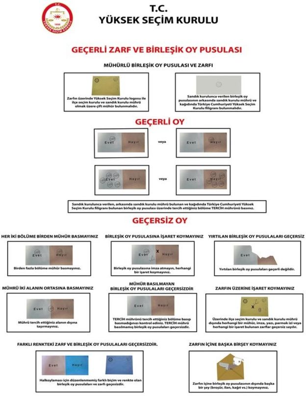 Seçmenler, beyaz renk üzerinde "Evet", kahverengi renk üzerinde "Hayır" ibareleri bulunan iki ayrı renkten oluşan birleşik oy pusulaları ile "tercih" mührü kullanacak.