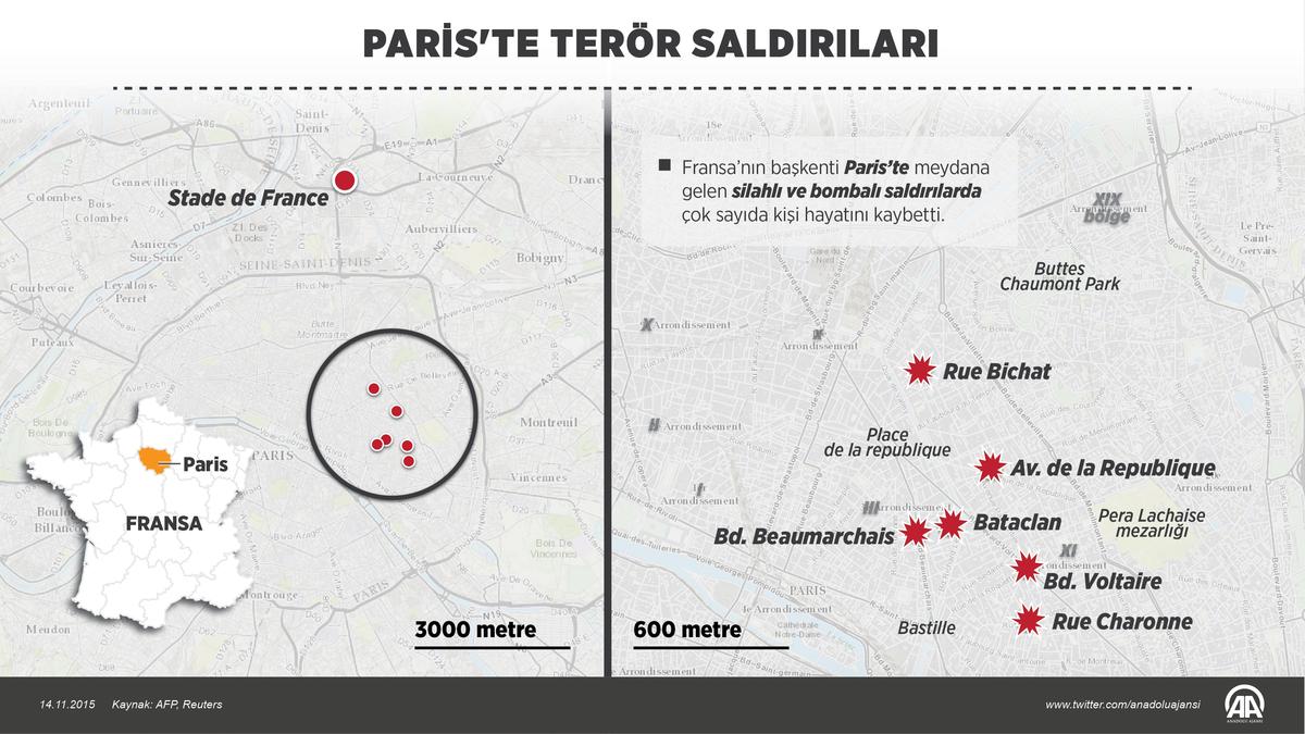 Fransa'nın başkenti Paris'te Almanya-Fransa futbol maçının yapıldığı stadın yakınlarında, bir konser salonunda ve bir restaurantta saldırı düzenlendi. 128 kişinin hayatını kaybettiği açıklandı. Ülkede 3 günlük yas ilan edildi.