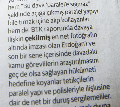 AK Parti iktidarı, son dönemde, Gülen Cemaati’yle savaşının bir parçası olduğu izlenimini fazlasıyla verecek şekilde, Dink cinayetiyle ilgili soruşturmada, ‘Paralel yapı’ olarak adlandırılan cemaate yakın polisler arasında ilişkilere vurgu yapmaya başladı. Hükümet yanlısı medya, yürümekte olan soruşturmanın ‘paralel yapı’nın cinayetteki sorumluluğunu ortaya çıkaracağı algısını yerleştirmeye çalışıyor. Cinayetin, bizzat Gülen Cemaati tarafından, Ergenekon davasının başlaması için TSK’yı itibarsızlaştırmak amacıyla işlendiği görüşü dört bir koldan empoze ediliyor.