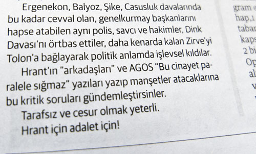 Şurası net: Agos olarak, Hrant Dink cinayetinin, Cemaat’le ilişkili ya da ilişkisiz polislerin yanı sıra, ordu, bürokrasi, Milli İstihbarat Teşkilatı ve bunların türlü kurum ve kesimlerdeki uzantılarının el birliğiyle işlendiğini biliyoruz. Bu yüzden de, Hrant Dink cinayetinin sadece kerameti kendinden menkul bir ‘paralel yapı’ya yıkılmasına razı değiliz. “Bu dava ‘paralel’e sığmaz” manşetlerini de, kurulmak istenen oyunu gördüğümüzü göstermek için attık. Cinayete dair gerçeklerin en ufak bir parçasının dahi ortaya çıkması, şüphesiz ki değerlidir. Yürüyen soruşturma bunu yapacak mı, göreceğiz. Ancak, tüm sorumluları açık etmeyen, siyasi bir hasmı alt etmeyi amaçlayan bir soruşturma ve iddianameyi de gerçeğin kendisi olarak kabul etmeyecek kadar deneyimliyiz.
