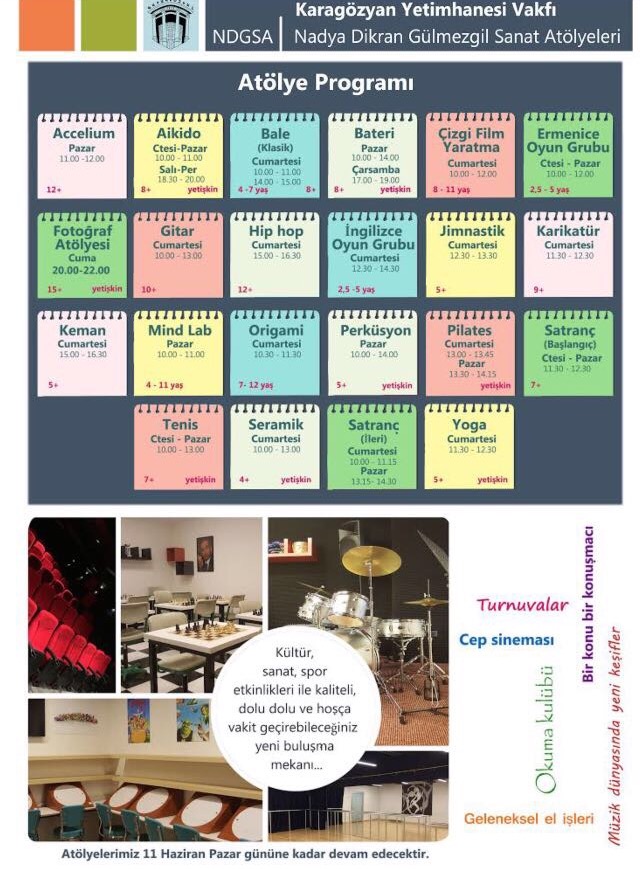 Arlin Şahbaz Şeremet’in İngilizce oyun grubu, Alperen Alkan’ın perküsyon, Ari Hergel’in gitar, Nora Tokhosepyan’ın hip-hop, Ari Küdyan’ın aikido ve Manuel Çıtak’ın fotoğraf atölyelerini yürüteceği program, yeterli katılımın sağlaması durumunda keman, Mind Lab ve Accelium’u da bünyesine katacak.