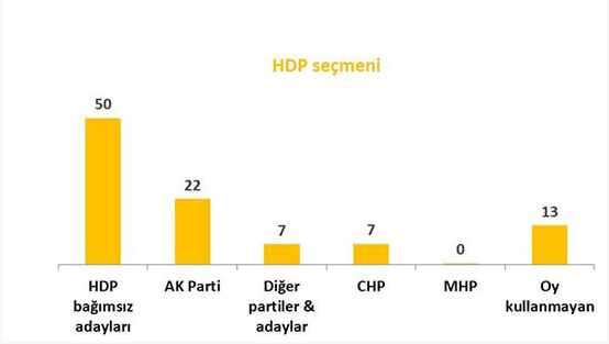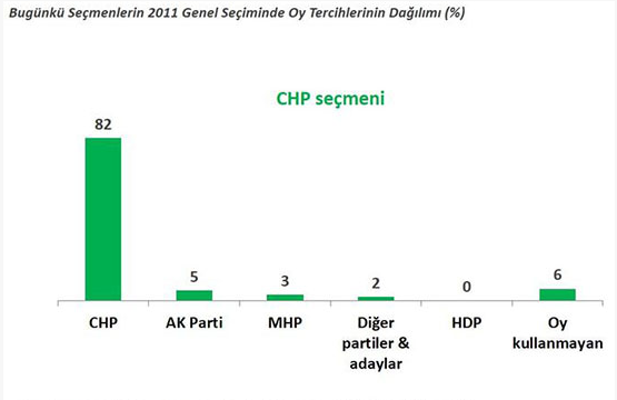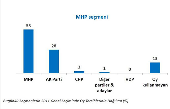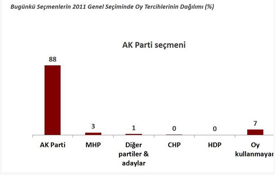Bu seçimde AK Parti’ye oy veren seçmenlerin yüzde 80’i 2011’de de yine aynı partiye oy vermiş. MHP’den ise yüzde 3 almış. Bu seçimde CHP’ye oy verenlerin yüzde 5’i ise 2011’de Ak Parti’den yana tercihini kullanmış. En dikkat çeken sonuçlar ise MHP’de. MHP’ye 7 Haziran’da oy verenlerin yüzde 28’i 2011’de AK Parti’ye oy vermiş. Yüzde 13’ü ise 2011’de oy kullanmamış. HDP de hemen her partiden seçmen çekmiş. En fazla oy kazandığı parti ise yüzde 22 ile AK Parti.