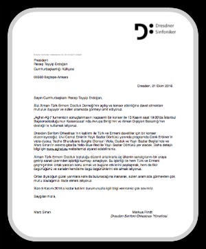 Dresden Senfoni Orkestrası, Ermeni Soykırımı'nın 100’üncü yılı için hazırladığı “Ağıt“ (Aghet) adlı eserini, 13 Kasım’da Almanya’nın İstanbul’daki başkonsolosluğunda verilecek konserde icra etmeye hazırlanıyor. Konsere Dresden Senfoni Orkestrası’nın aylık etkinlik programında da yer verildi. Konserin ardından Alman-Türk-Ermeni Dostluk Topluluğu'nun düzenleyeceği bir de etkinlik olacak. Bu iki organizasyona Cumhurbaşkanı Recep Tayyip Erdoğan, Başbakan Binali Yıldırım, Dışişleri Bakanı Mevlüt Çavuşoğlu ve Kültür Bakanı Nabi Avcı da davet edildi.