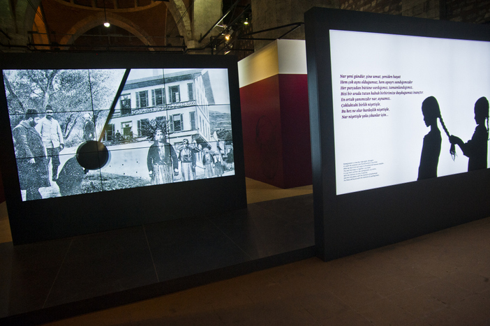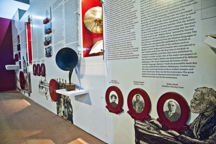 Sergiyi küratörün kurgusunun sizi yönlendirdiği gibi sağ taraftan izlemeye başladıysanız sizi belgelerin hemen ardından oldukça renkli bir ‘Bizim Ermenilerin’ Osmanlı sosyal-kültürel-mimari tarihindeki temsili kısmı bekliyor ziyaretçiyi. Ünlü Ermeni mimarları, Osmanlı imparatorluğunda Ermeni yazın ve basın/m tarihi, Ermeni tiyatrosu, müziği ve müzisyenleri hakkında görseller, objeler ve kısa anlatılar oldukça hoş ve rahatlatıcı bir izlenim ve haleti ruhiye yaratacak cinsten. Kişisel merakımdan özellikle Ermenice kitaplara bakıyorum, biri hariç Osmanlı son döneme ait oldukça rasgele seçilmiş, Ermeni yayın tarihinde özel bir önemi olmayan yıllıklar, konuşma kılavuzu, sözlük, çeviri... Zanaat kısmında sergilenen objeler için de aynısını söyleyebilirim. Bu arada gözüm Basın Edebiyat Mizah bölümünde altta yuvarlak çerçeveler içerisindeki Zabel Yesayan ve Krikor Zohrab’a takılıyor. Hiçbir açıklama yok, ne yazdılar, ne yaşadılar ve (Krikor Zohrab, Daniel Varujan ve diğerleri) niye öldüler ve daha önemlisi bizlere ne anlatmaya çalıştılar, koca bir suskunluk....