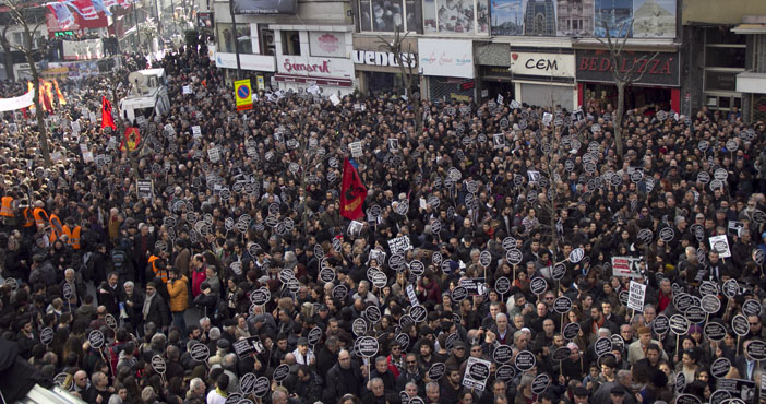 A group carrying an image of Hrant Dink’s eyes. Similar images were used recently in the aftermath of the Charlie Hebdo attack across the World, featuring the eyes of the cartoonists who were massacred.