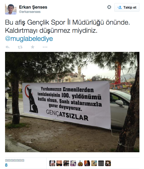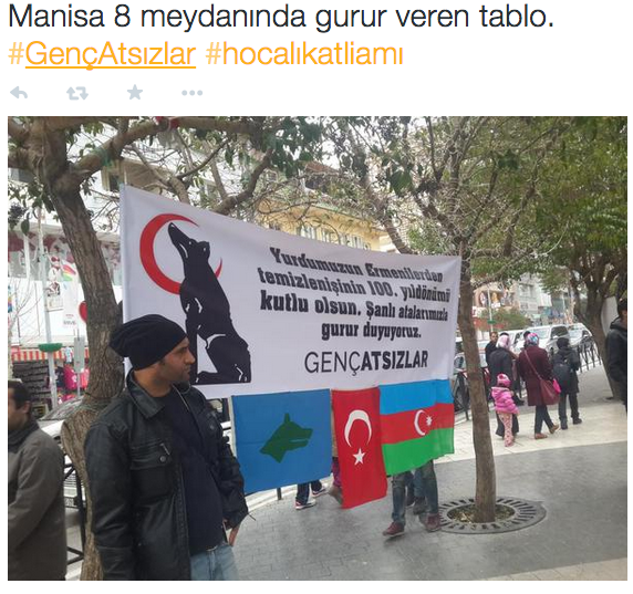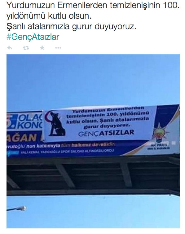 ‘Genç Atsızlar’ isimli bir grup ise Muğla, Manisa ve Ordu gibi şehirlerde Ermenilere yönelik nefret söylemi içeren afişler hazırlayıp astı. Afişte ‘Yurdumuzun Ermenilerden temizlenişinin 100. yıldönümü kutlu olsun. Şanlı atalarımızla gurur duyuyoruz’ yazıyor.