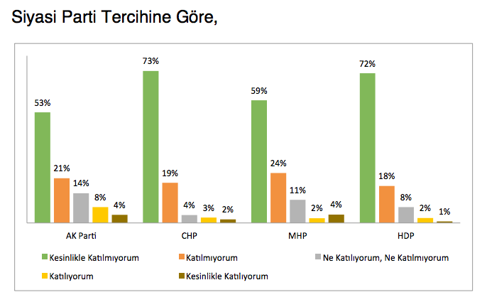Katılımcıların siyasi görüşünün de sorulduğu anket sonuçlarına göre, hangi partiye oy verdiğinden bağımsız olarak katılımcıların çoğunluğu zeytin alanlarını imara açılmasına karşı çıkıyor.