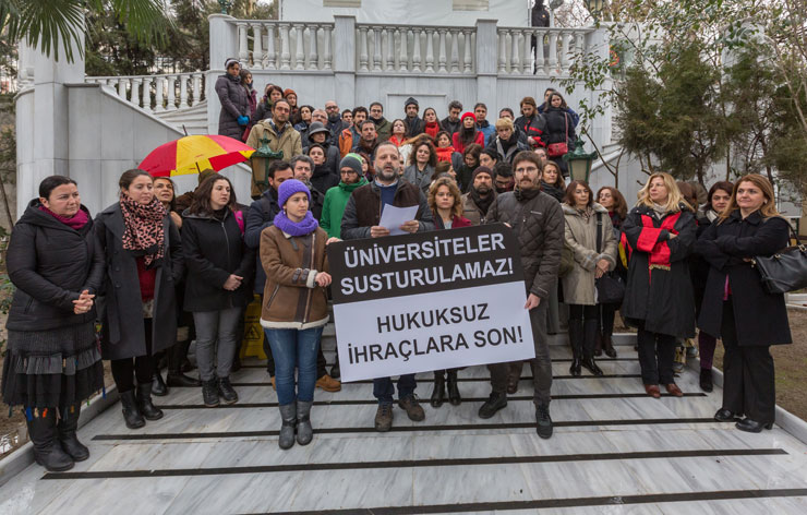 Diken’de yer alan habere göre, Üniversitenin merdivenlerinde, “Üniversiteler susturulamaz, hukuksuz ihraçlara son” pankartıyla yan yana gelen akademisyenler, kanun hükmünde kararnamelerle meslektaşlarının uğradığı kıyıma karşı bir basın açıklaması yaptı.