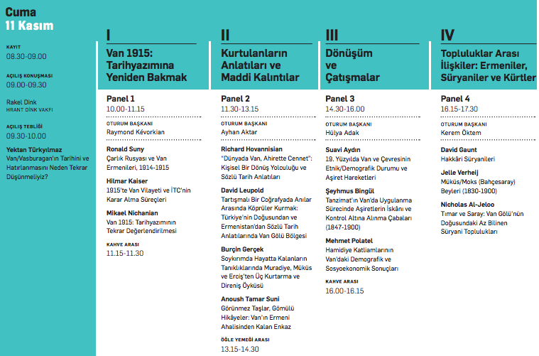 11 Kasım Cuma günü 9.00’da Hrant Dink vakfı Başkanı Rakel Dink’in açılış konuşmasıyla başlayacak olan iki günlük konferansın programında, toplam yedi panelin yanı sıra, Yektan Türkyılmaz’ın ‘Van/Vasburagan’ın tarihini ve hatırlanmasını neden tekrar düşünmeliyiz?’ başlıklı açılış tebliğ ve Ayhan Aktar’ın yöneteceği genel değerlendirme ve tartışmalar oturumu da yer alacak. Konferans, Friedrich Ebert Vakfı ile SivilDüşün AB programı tarafından destekleniyor.