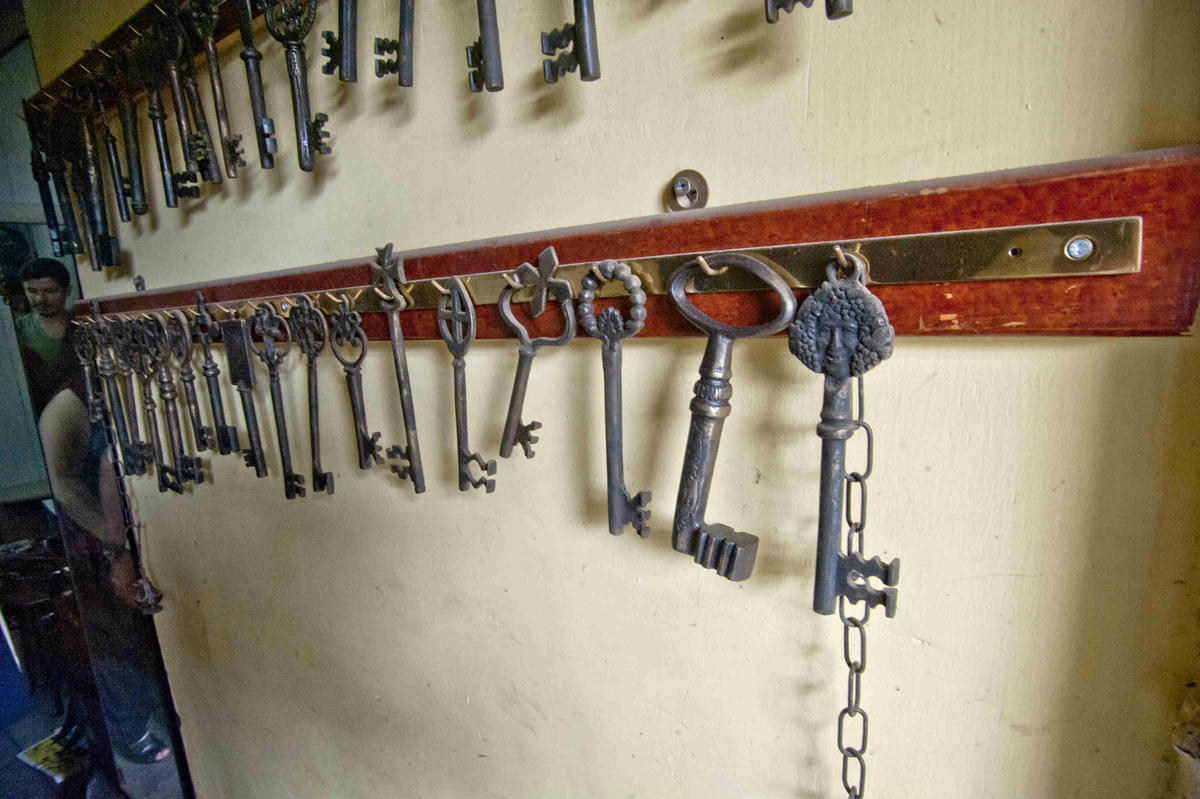Dış merdiven çökmüş. Koca taş merdivenden yukarı çıkıyoruz. Vezir Hanı’ndaki üst kat da, zamanın dışına düşmüşlüğün rehaveti içerisinde. Kalıp döküm turistik eşyanın üretildiği bir atölyedeki, çoğu asma kilitli kilise kapılarına ait olduğu anlaşılan değişik motifli koca anahtarlar bu durağanlığın simgesiymişçesine asılı oldukları demirin ucunda usul usul sallanıyor. Onların açacağı bir kapı yok artık. Sergilendikleri bu yerin kaderi de tıpkı kendi geçmişleri gibi muallak.
