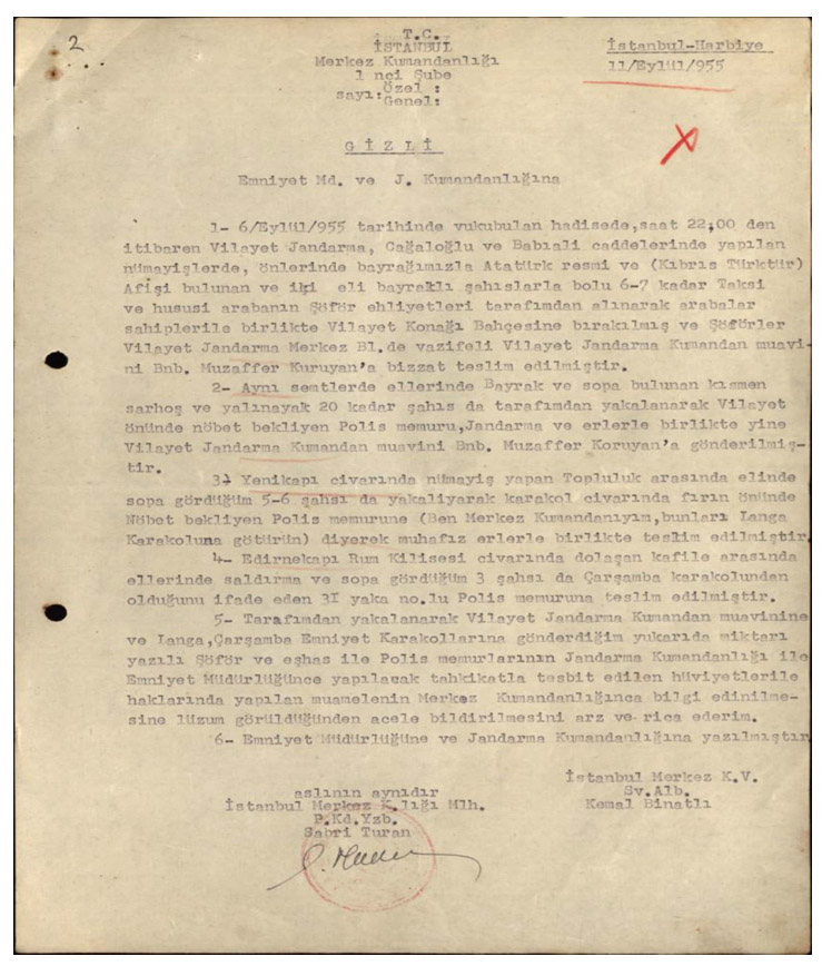 “6-7 Eylül hadise günü Vilayette bulunduğunuz zamanlardaki müşahadelerinizi (gözlemlerinizi) yazılı olarak bildirmenizi rica ederim. 14/12/1955
