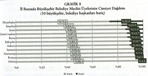 ‘Yerel Demokrasi Sorunsalı’ çalışmasında belediye meclisi üyelerinin profiliyle ilgili de ayrıntılı veriler yer alıyor. İstatistiklerde kadın-erkek eşitsizliği tüm çıplaklığıyla ortada. 81 ili kapsayan verilere göre belediye erkek meclis üyesi oranı %89’a ulaşırken kadın üye oranı %10’da kalıyor. Karar mekanizmasının baş aktörü olan belediye başkanı oranları çok daha çarpıcı: Kadın:%2, erkek: %97.