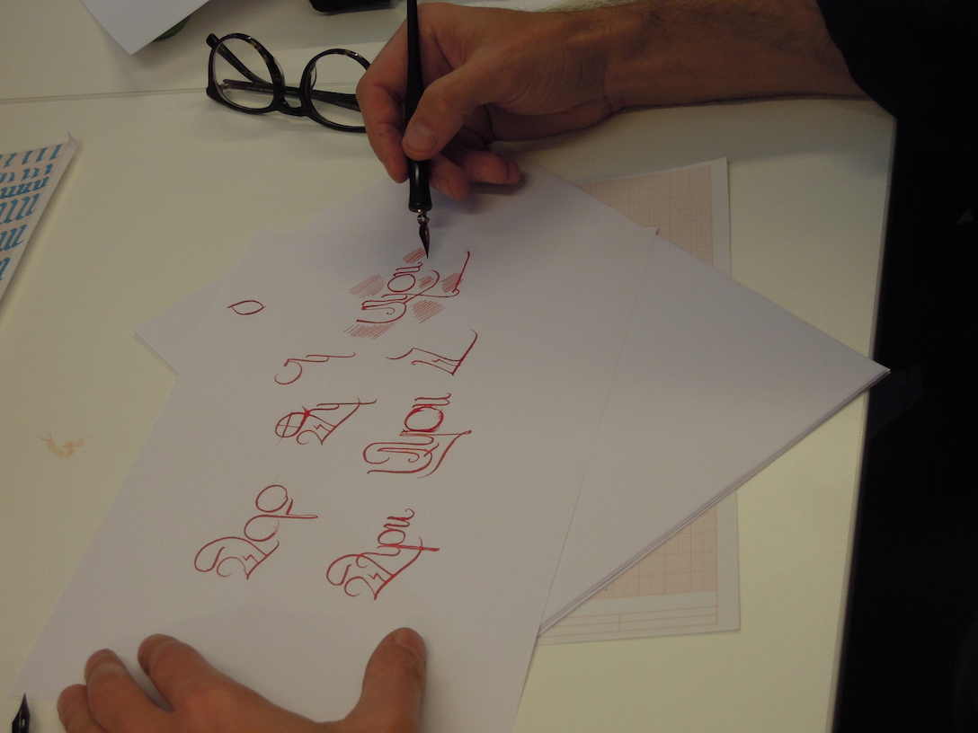 Zaman zaman da tüm gruba yönelik tarihsel örnekler sundu ve bizzat kendisi tasarımlar yaptı. Standart kesik kalem ucunu yararak nasıl iki uç haline getirdiğini, iki farklı kalemden çıkmış gibi gözüken çizginin esasında tek bir uçla yazıldığını uygulamayla anlattı.