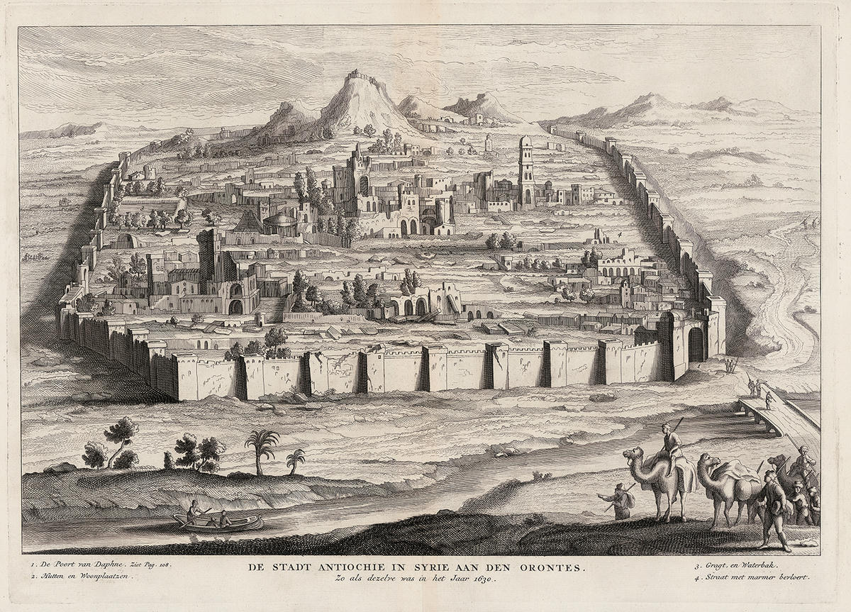 Sergideki bir kartpostalda, Antakya’nın 1630’daki durumunu gösteren bakır baskı bir gravür yer alıyor. Şehir Asi yakınında ama asıl yerleşim bölgesi dağın yamaçlarına uzanıyor. Muhtemelen, 1615 depremi sonrasında kurulmuş olan şehir bu. Ancak sergideki kartpostalların çoğunda, 1872 depremi sonrasında kurulan şehri yansıtan görseller var.