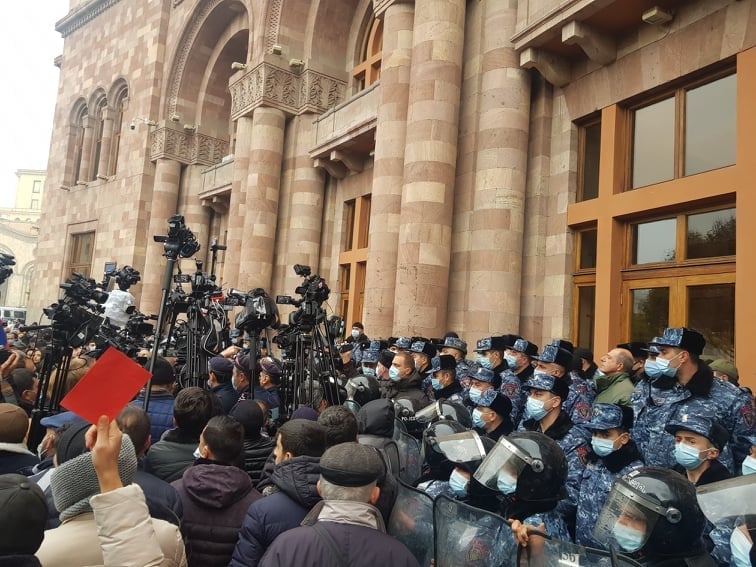 Լուսանկարում կառավարութեան շէնքն է, որտեղ գտնւում է վարչապետը եւ հսկւում է եռաշերտ կանգնած ոստիկաններով, որոնք պաշտպանում են վարչապետին իրեն 2,5 տարի առաջ ընտրած ժողովրդից։