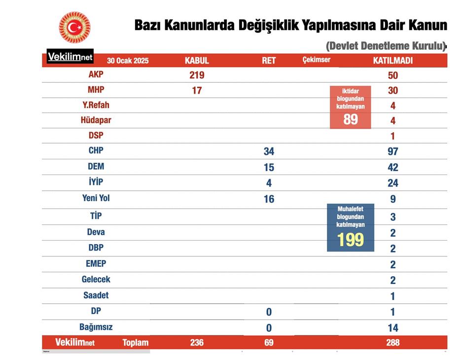 Tam kadro derken netleştirelim: Bağımsızlar ve muhalefetten 199 vekil oylamaya katılmadı. Teklife sadece 69 muhalefet milletvekili karşı çıktı. Böyle olunca AKP 219 vekili ve ona destek veren 17 MHP’liyle teklifi TBMM’den geçirdi.
