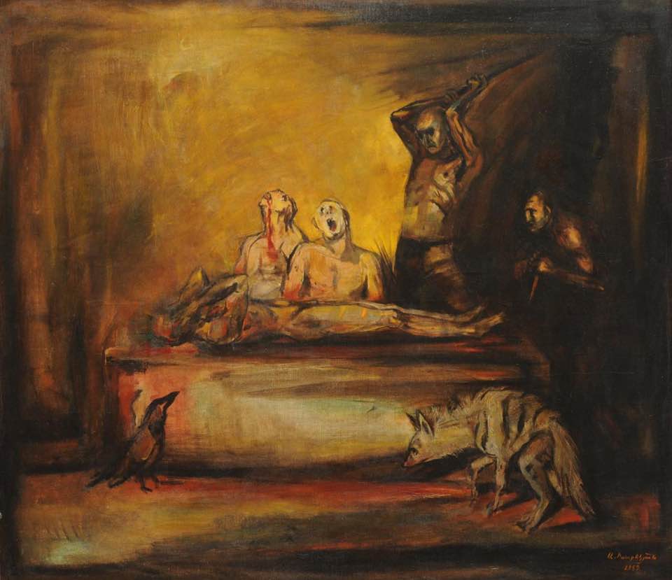 «Այս երկու նկարները երբ նկարում էի, աչքիս առաջ էին ազերիների վայրագութիւնները Սումգայիթում եւ Պաքւում, յետոյ նաեւ մեր երիտասարդ սպայի գլխատումը Պուտապեշտում եւ վայրենու հերոսացումը ազերի հայատեացի կողմից։ «Բորենիների խրախճանք» 105x110 կտ., իւղ նկարել եմ 1989 թուին, յաջորդը « Սումգայիթ» կոչուող կտաւը 130x115 կտ, իւղ ստեղծեցի 2010 թուին, մօտ կէս ամիս աշխատեցի այս կտաւի վրայ, ցանկանալով զգացածս ճիշդ արտայայտել։ Երբ Շուշիում կերպարուեստի թանգարան բացուեց, որոշեցի նուիրել այս աշխատանքը նորաբաց թանգարանին։ Որոշ ժամանակ անց երբ եղայ Շուշիում, այցելեցի թանգարանը եւ տեսայ, որ նկարս ներքեւի յարկում մի տեղ ցուցադրել են, հասկացայ, որ մի բան էն չի եւ քանի որ մեզ հետ էր Արցախի մշակոյթի նախարարը, հարցրի թէ ինչու էք թաքուն տեղում ցուցադրել, ասաց մի քիչ կմկմալով, գիտէք մենք յաղթել ենք, պարտուողական թեմաները այնքան էլ մեր սրտով չի... մօտաւորապէս այսպէս ասաց.... Հիմա երբ եղաւ այն ,ինչ որ եղաւ, եւ նորից տեսանք ազերիների եւ իրենց առաջնորդի իսկական դէմքը, որին այլաբանական պատկերել էի վերջին նկարում, չէ՞ք գտնում որ ես էի ճիշդ, որ չպիտի մոռանանք սրանց անմարդկաին էութեան մասին եւ որ սրանք մեր հաշուին են կայացնում իրենց չեղած ազգը.... Իսկ այս « Սումգայիթ» կտաւը, որ ձեր քիմքով չեկաւ եւ որը թանգարանի մնացած աշխատանքների հետ մնաց իրանց, կարելի է պատկերացնել ինչ հաճոյքով են ոչնչացրել։ Իսկ պատմութիւնը կրկնւում է, մենք էլ շատ դժուար ենք դասեր քաղում։ Վերջ!!!»